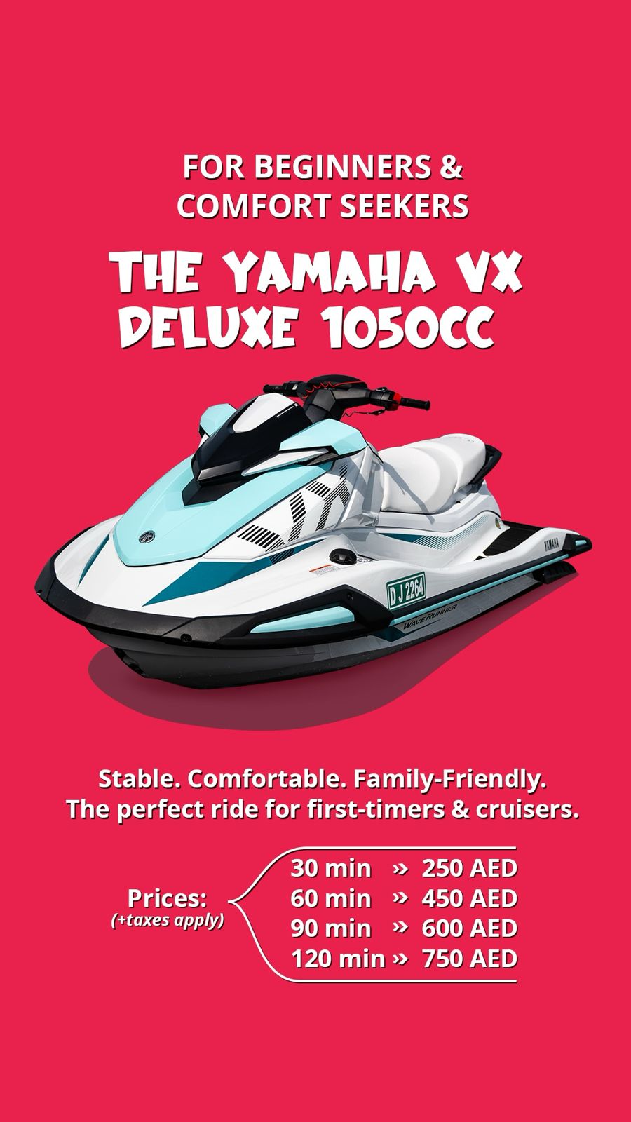 Up to two riders per jetski, no extra cost
